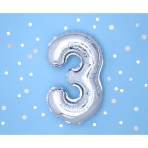 Metallic foil balloon Number ''3'', silver, size before inflation approx. 40 cm (16''), size after inflation approx. 35 cm (14''). Inflate with air.
