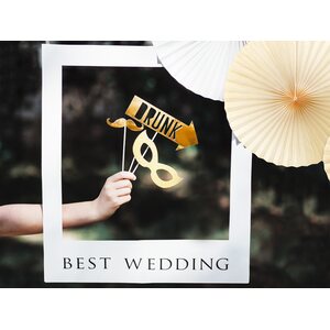 ArtikelbeschreibungSelfie photo frame kit, set contains: white photo frame with gold inscription Best Wedding (size after assembling approx. 50 x 59.5 cm, 1 piece), props on a stick in a gold colour (height after assembling approx. 21 – 42 cm, 8 pieces), clear balloons with a gold hearts print (size approx. 30 cm, 3 pieces) and approx. 3 m of a gold twine.