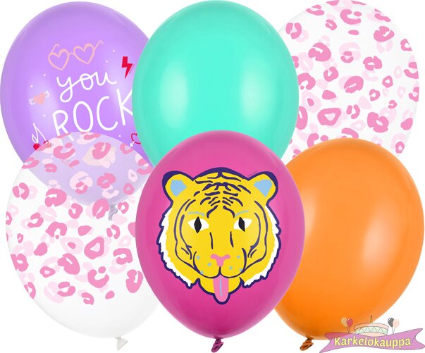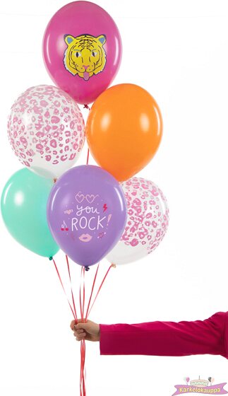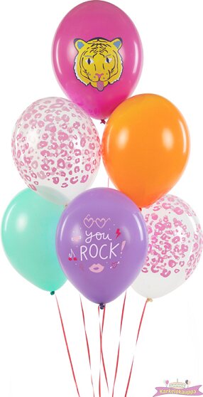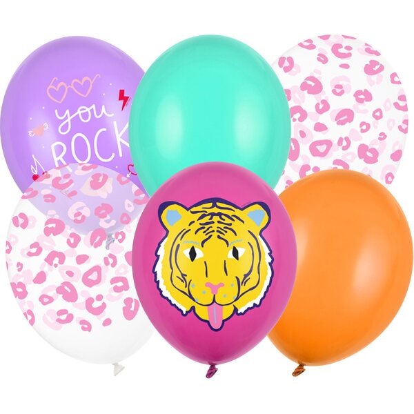 Descrizione del prodottoStrong balloons You Rock with print, set contains 6 balloons (1 in pastel Lavender Blue colour with colorful print, 2 in Crystal Clear colour with light pink colour, 1 in pastelHot Pink colour with colorful print 1 in Mint green colour and 1 in pastel Mandarin Orange colour), diameter approx. 30 cm.